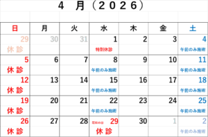 4月1日(水)・29日(水)及び各日曜日休院となります。
